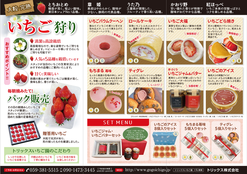 | ◎いちご狩り期間 1月~5月 ◎夏季営業期間 6月~11月 ※夏季営業期間もアイスクリームなどの販売を致しております。 |
