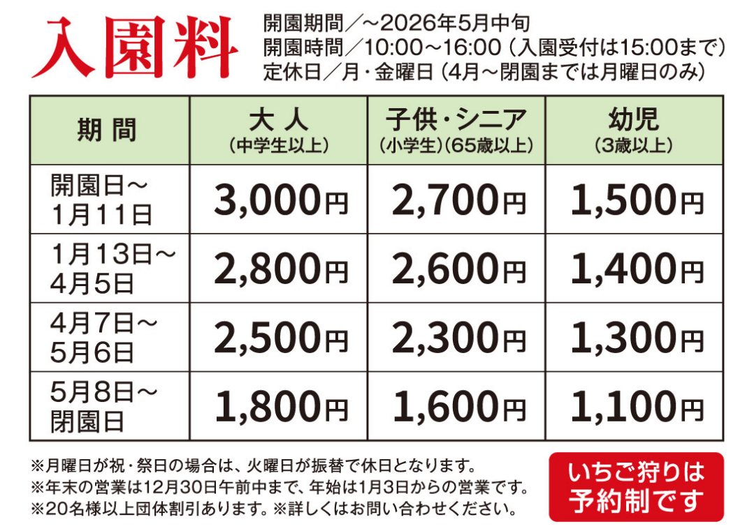 | [団体割引] | 20名様以上より、いちご狩り料金を100円引きいたします。 |