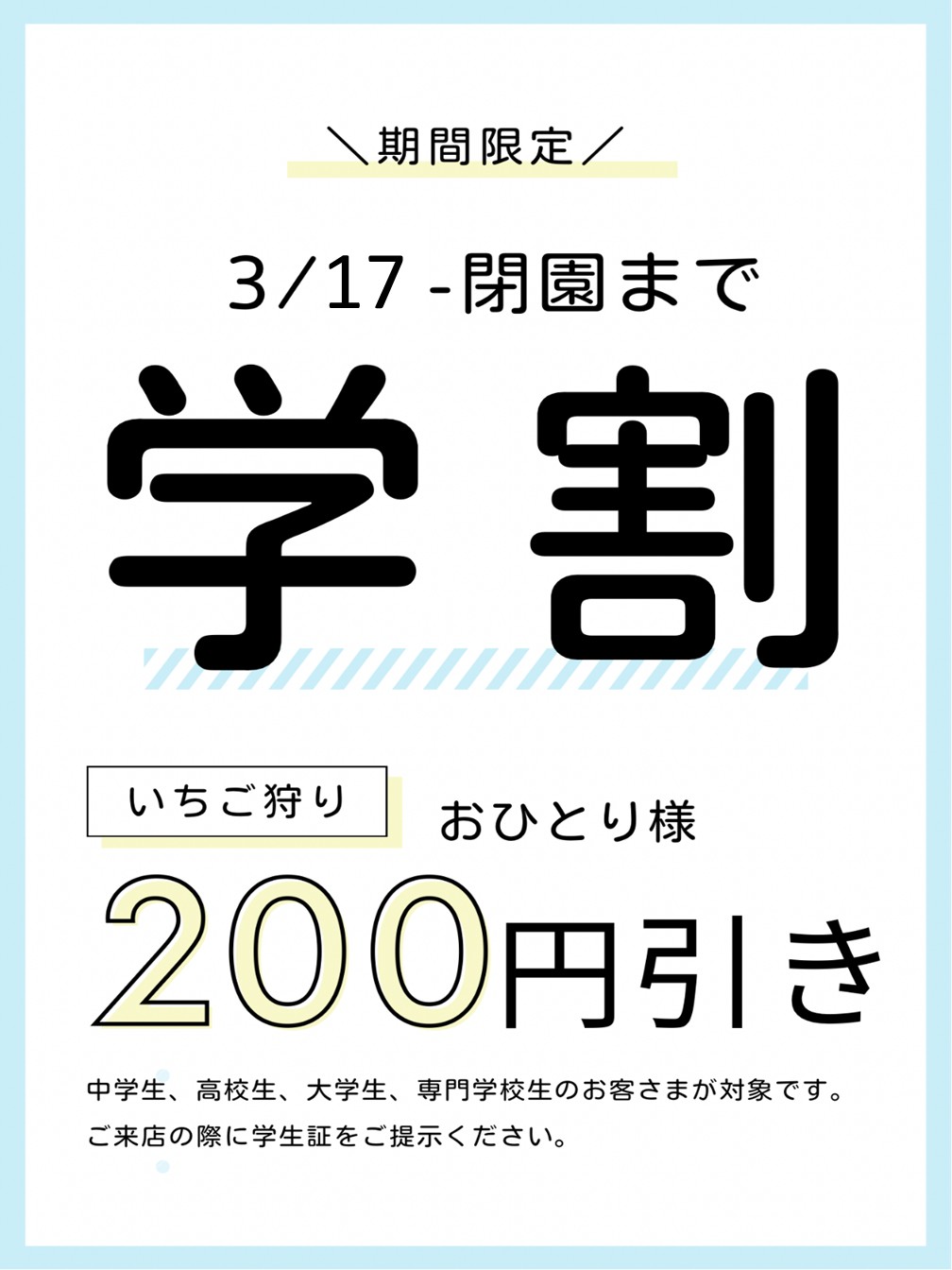 2026年3月17日から学生割引を開始いたしました!対象は「いちご狩り」のみとなります。